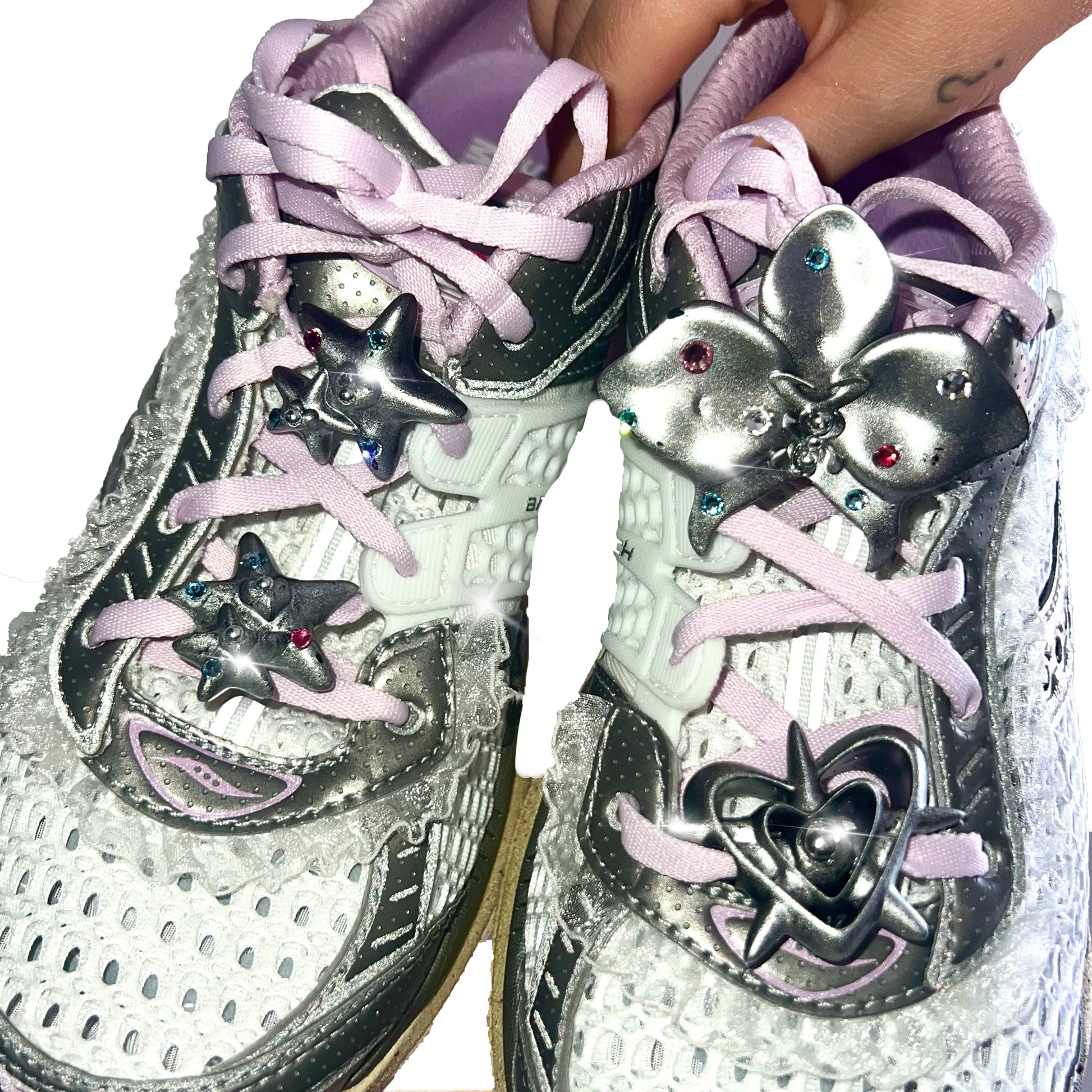SLIDE IN LACE SNEAKER CHARM WITH VARYING SHADE BLUE AND PINK CRYSTALS AND CHROME BEADS
